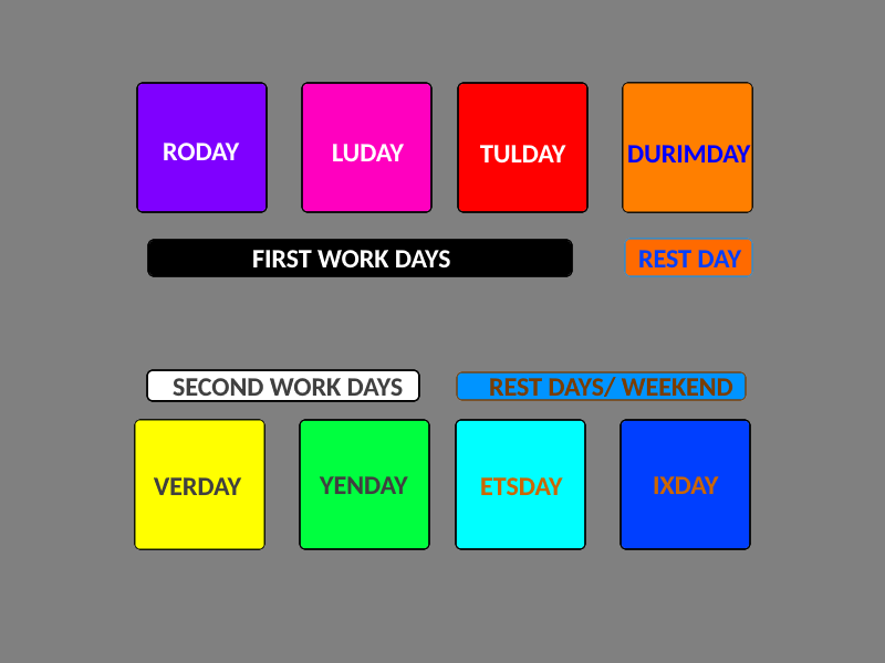 Some people take a rest day on Tulday or Yenday instead of Durimday. Some places only close on the established weekend of Etsday and Ixday.
